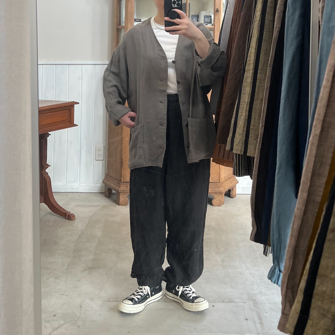 同じ布を使ったYAMMAのリネンダボ袖ジャケットとセットアップとしても使えます。