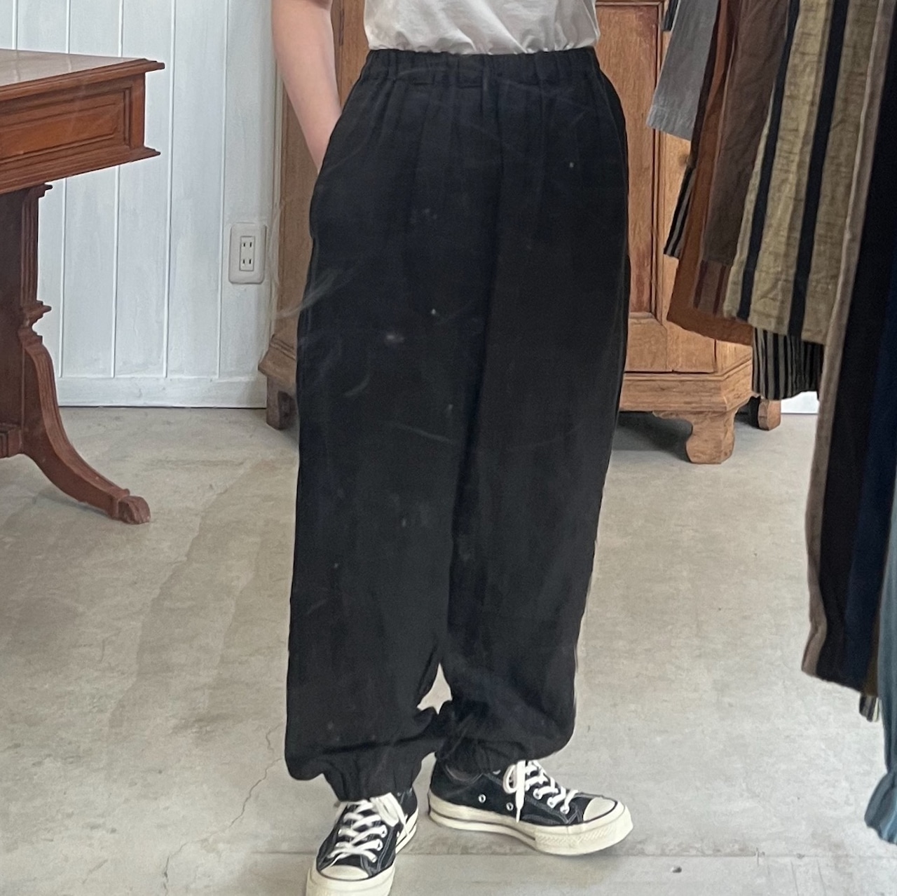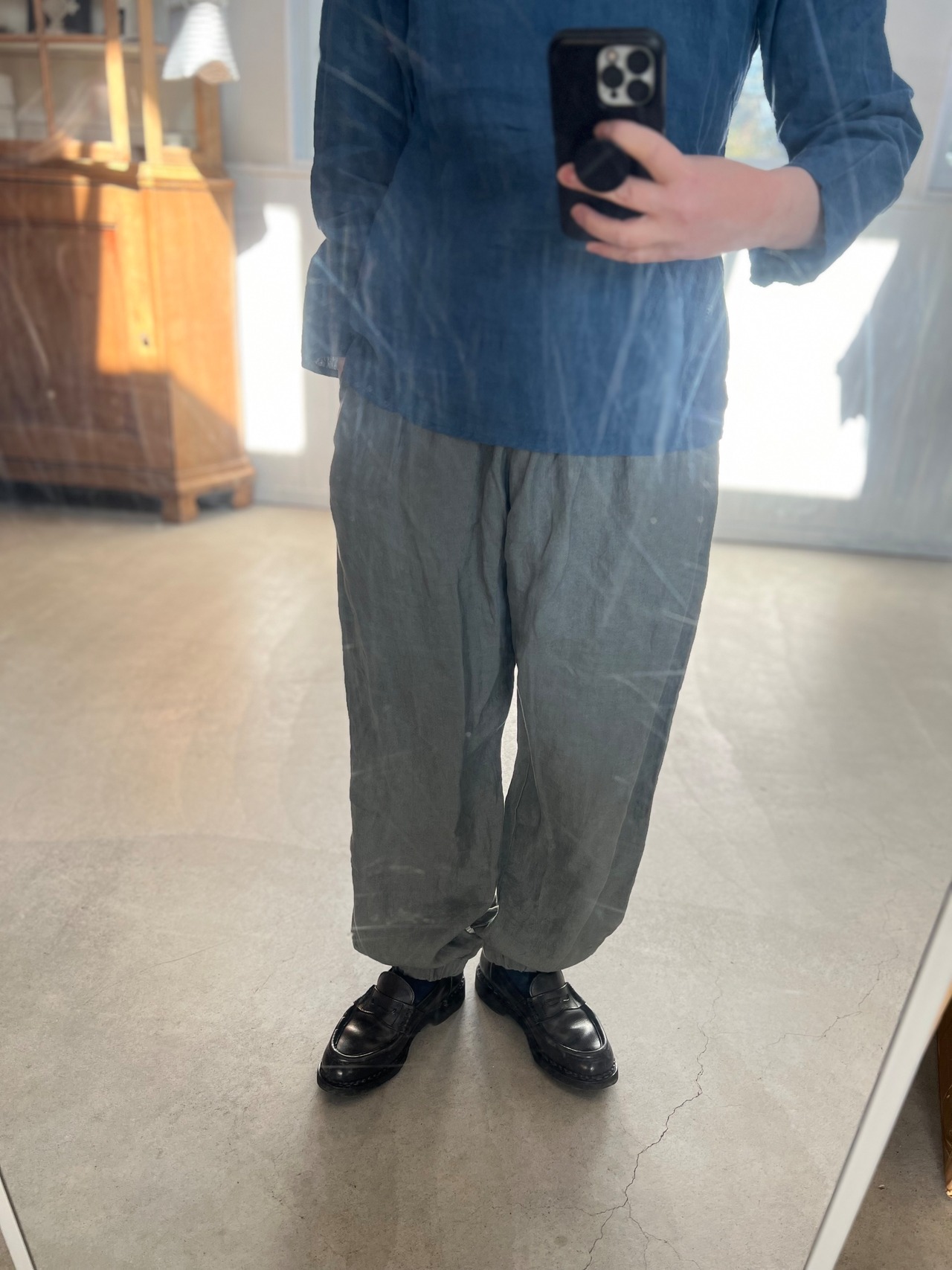 綾リネンの重みが縦の落ち感をつくりますが、裾にゴムが入っているのでずり落ちることなく足さばきは楽です。
