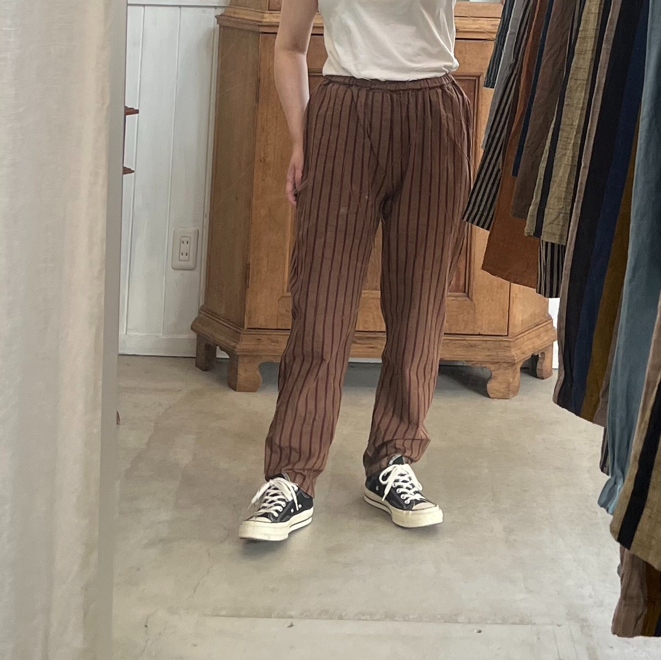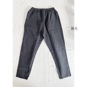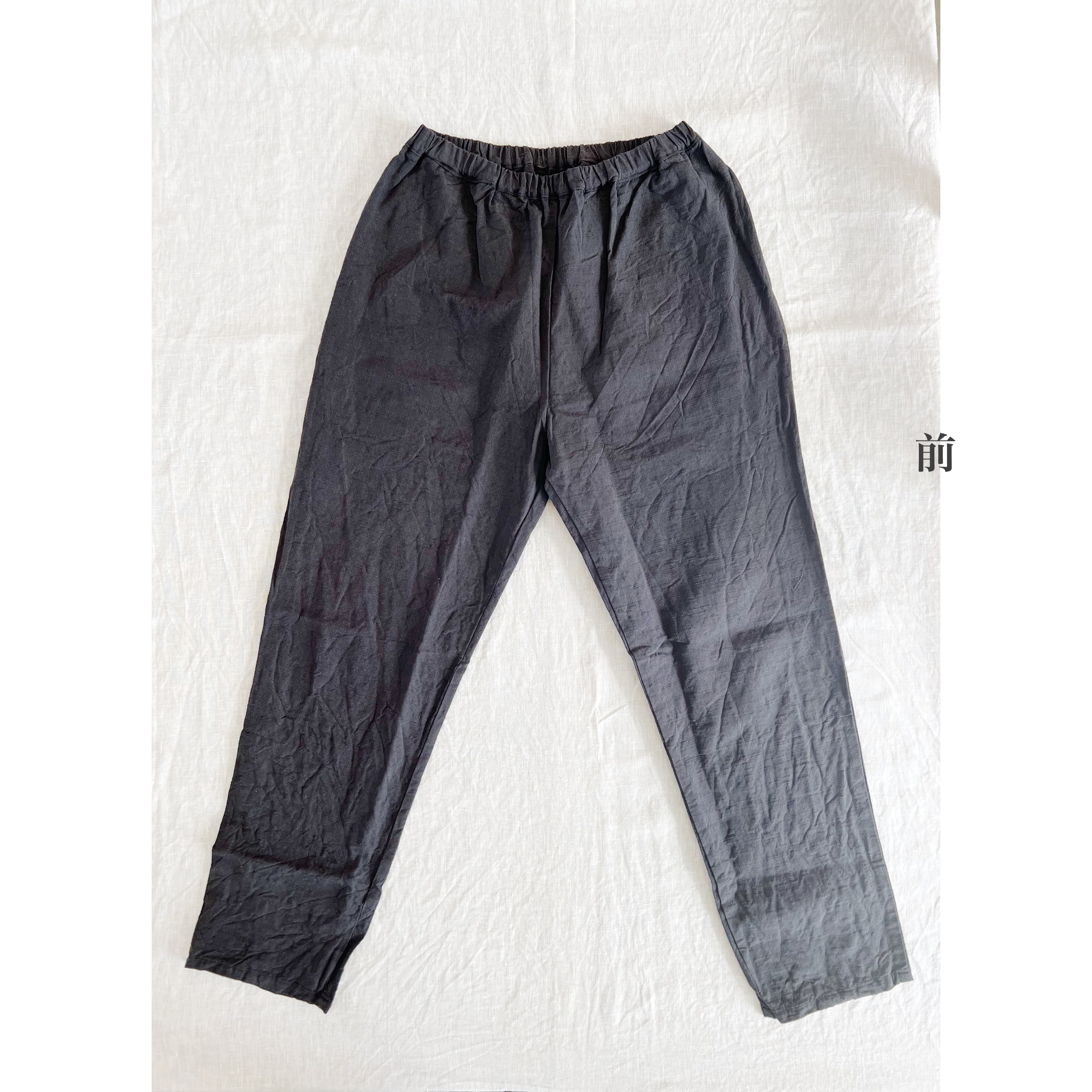 裾にかけて細くなる形がすっきりとした印象に見せてくれるこのパンツは、深い股上にお尻をすっぽりと入れてお尻周りのラインを隠してくれます。こちらは通常丈に15cmプラスしたタイプです。