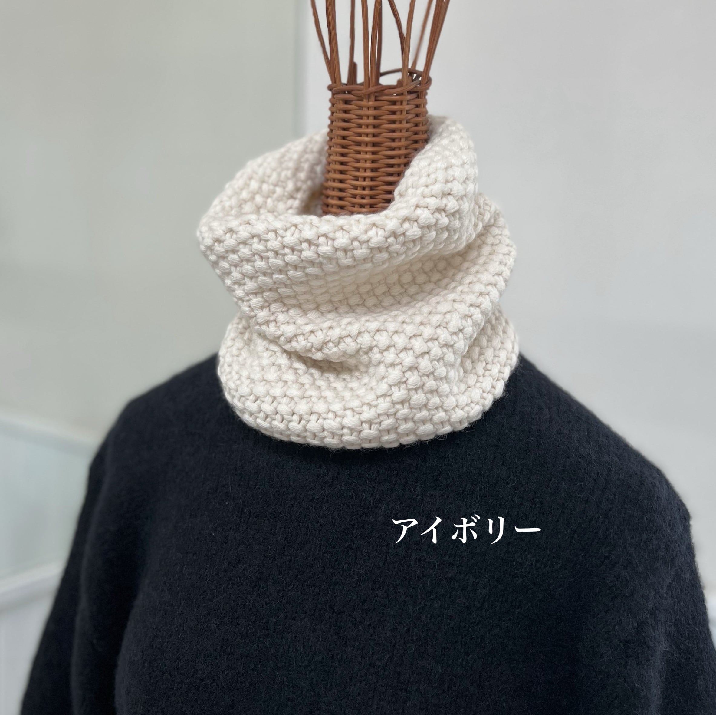 ポコポコとした編み模様が印象的なこのスヌードはしっかりと厚みがあり、首元を温めてくれます。