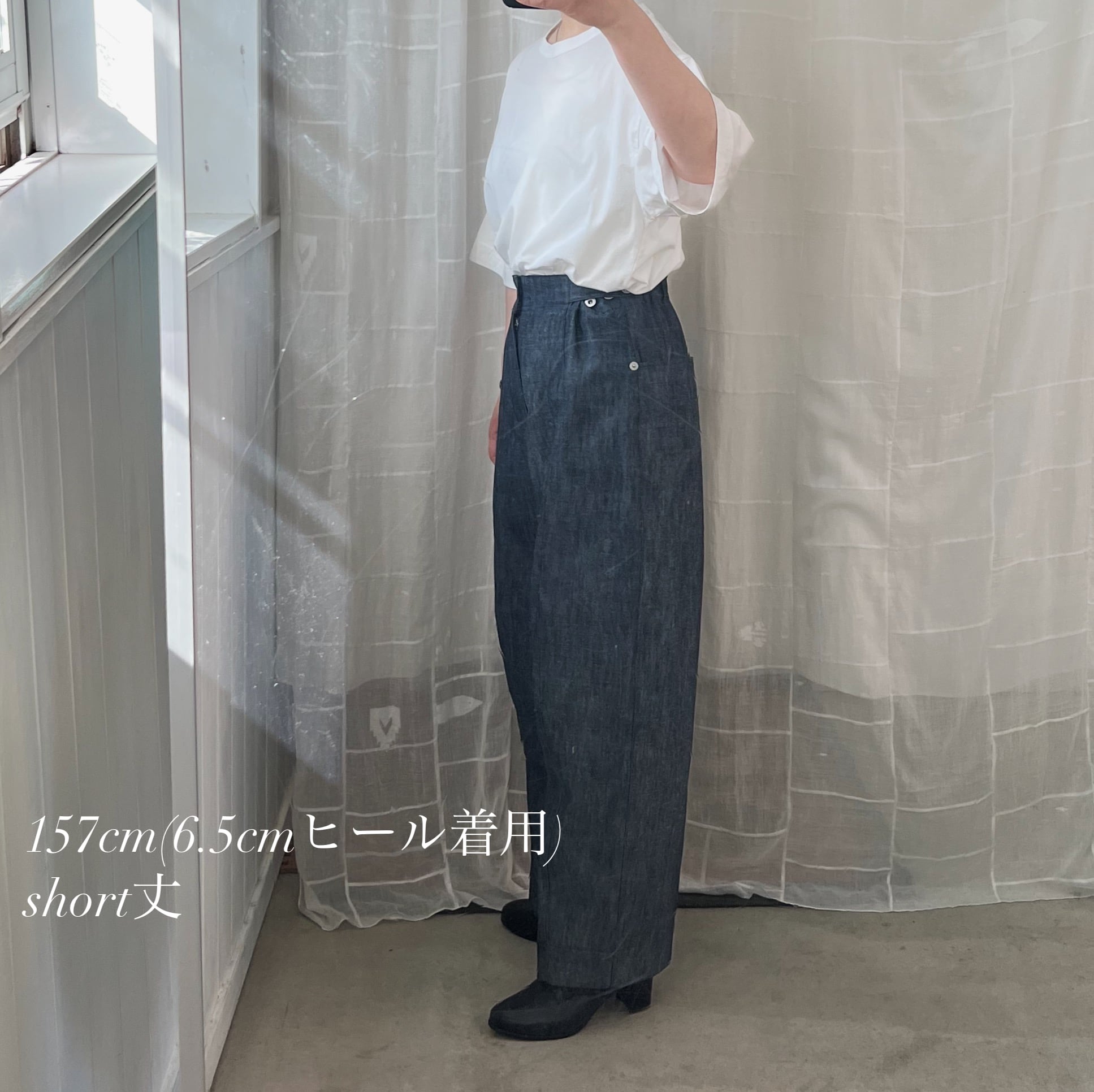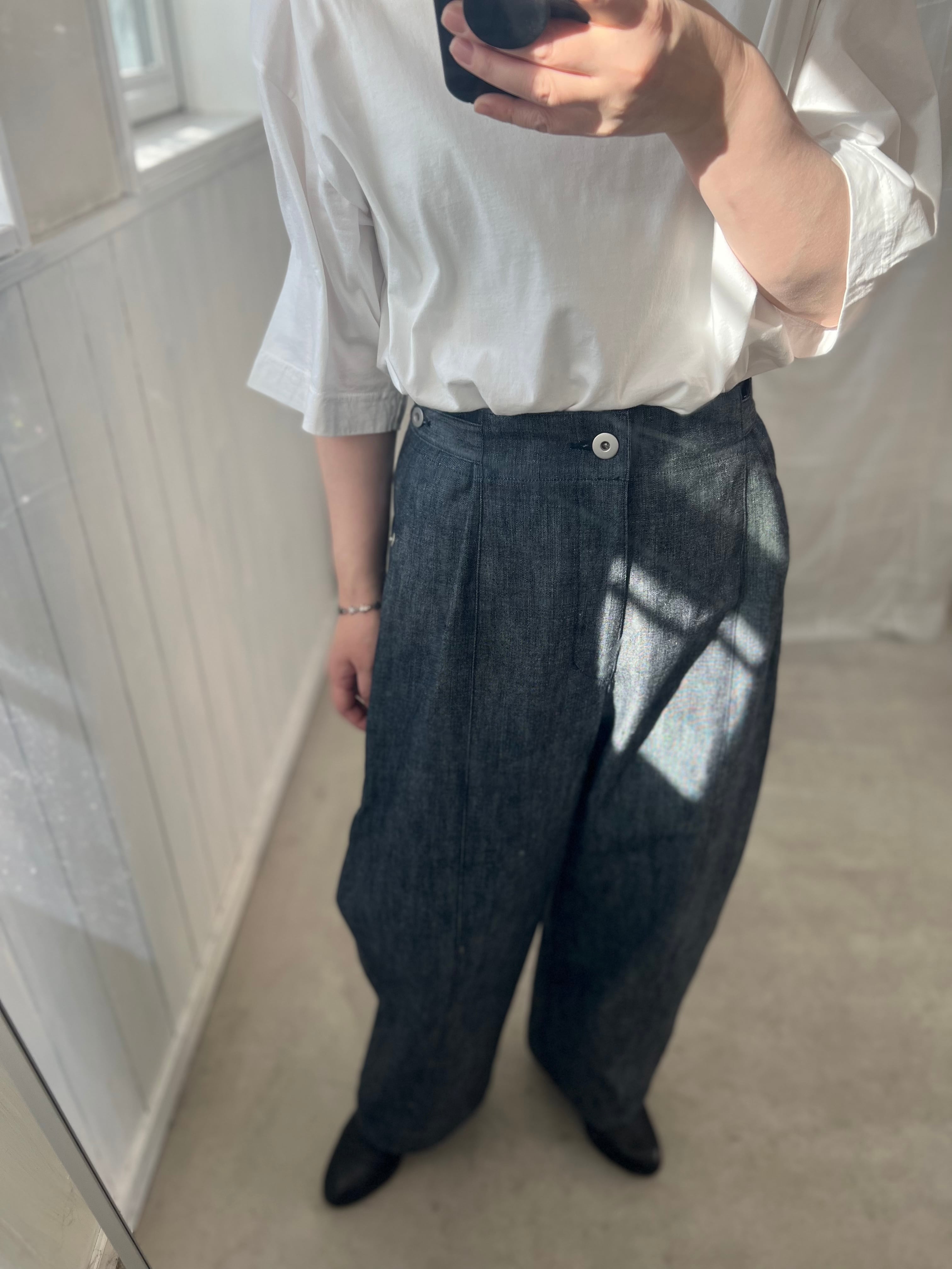 平織デニム生地のユニセックスパンツ。やや薄手で綺麗目に穿いていただける上品なデニムパンツです。