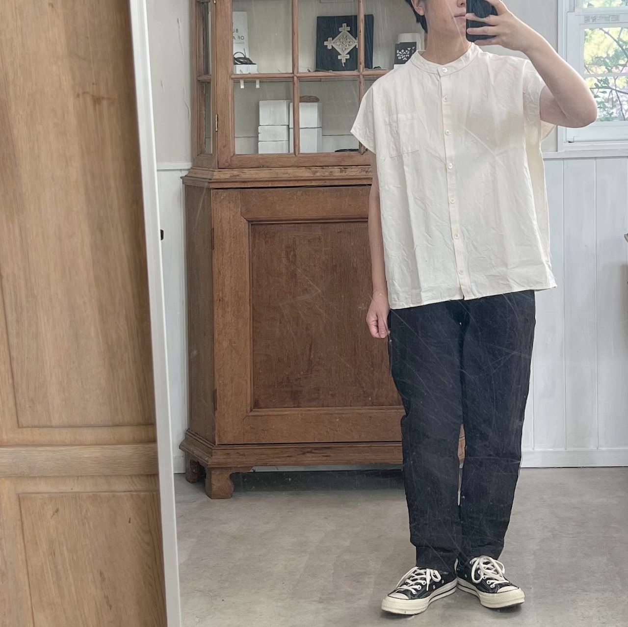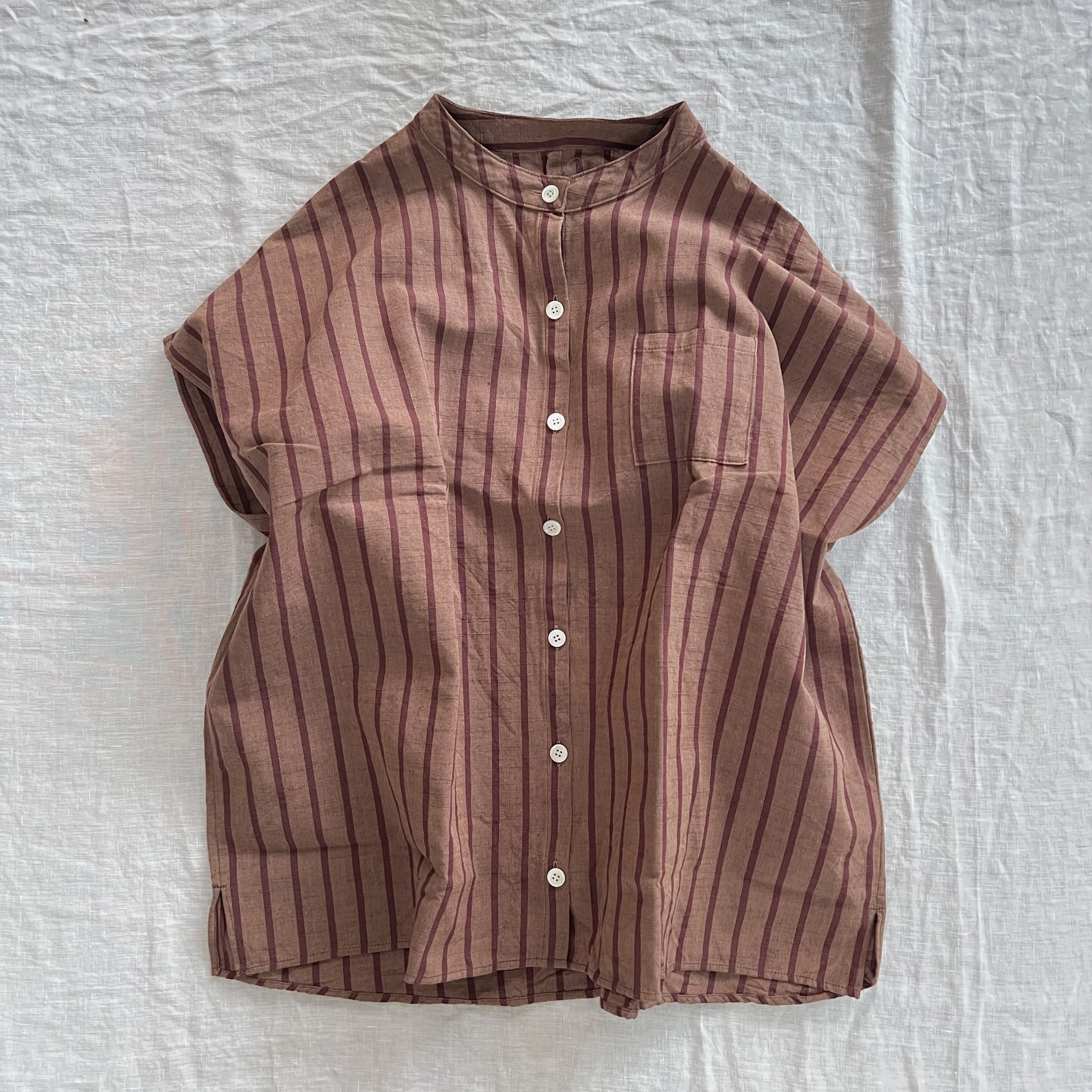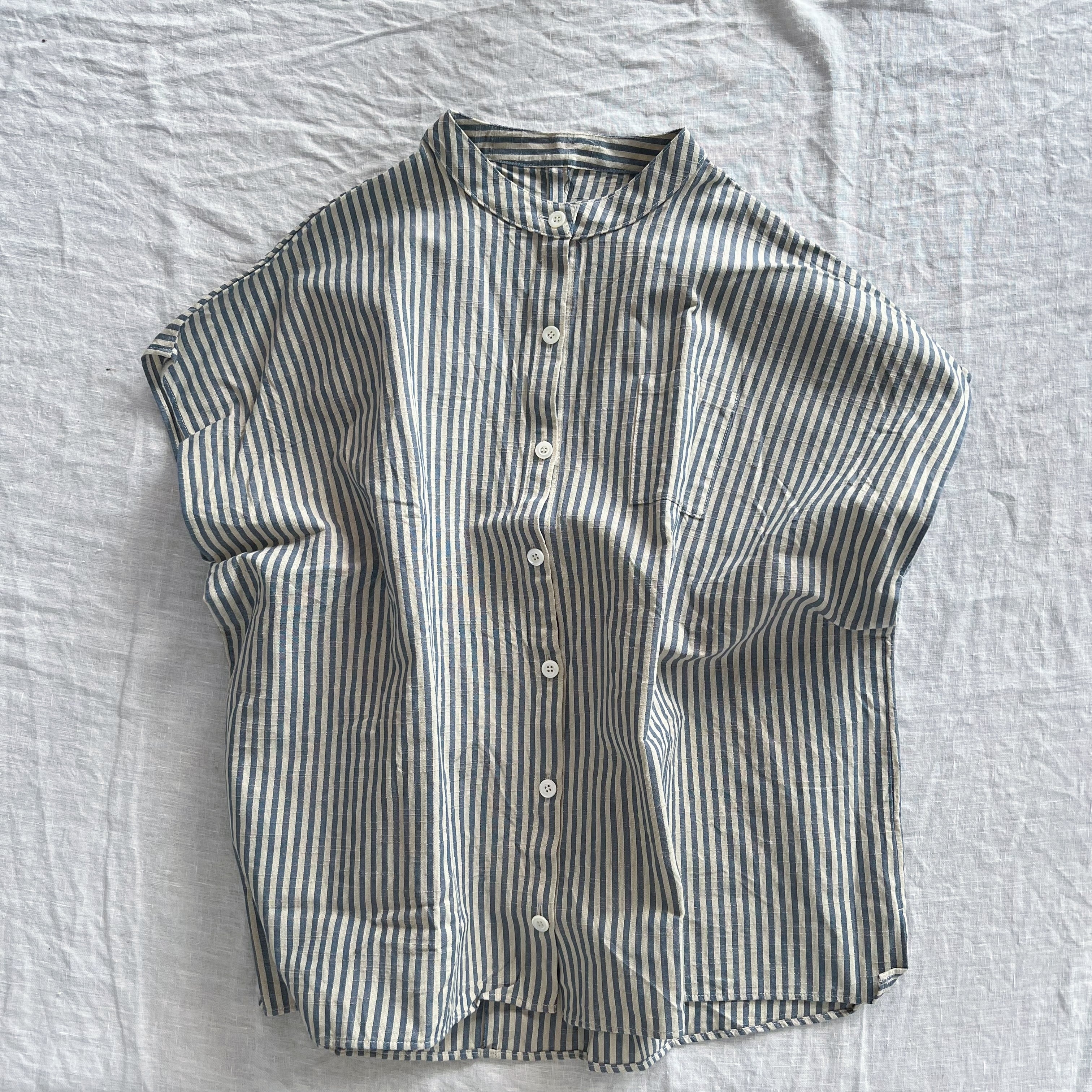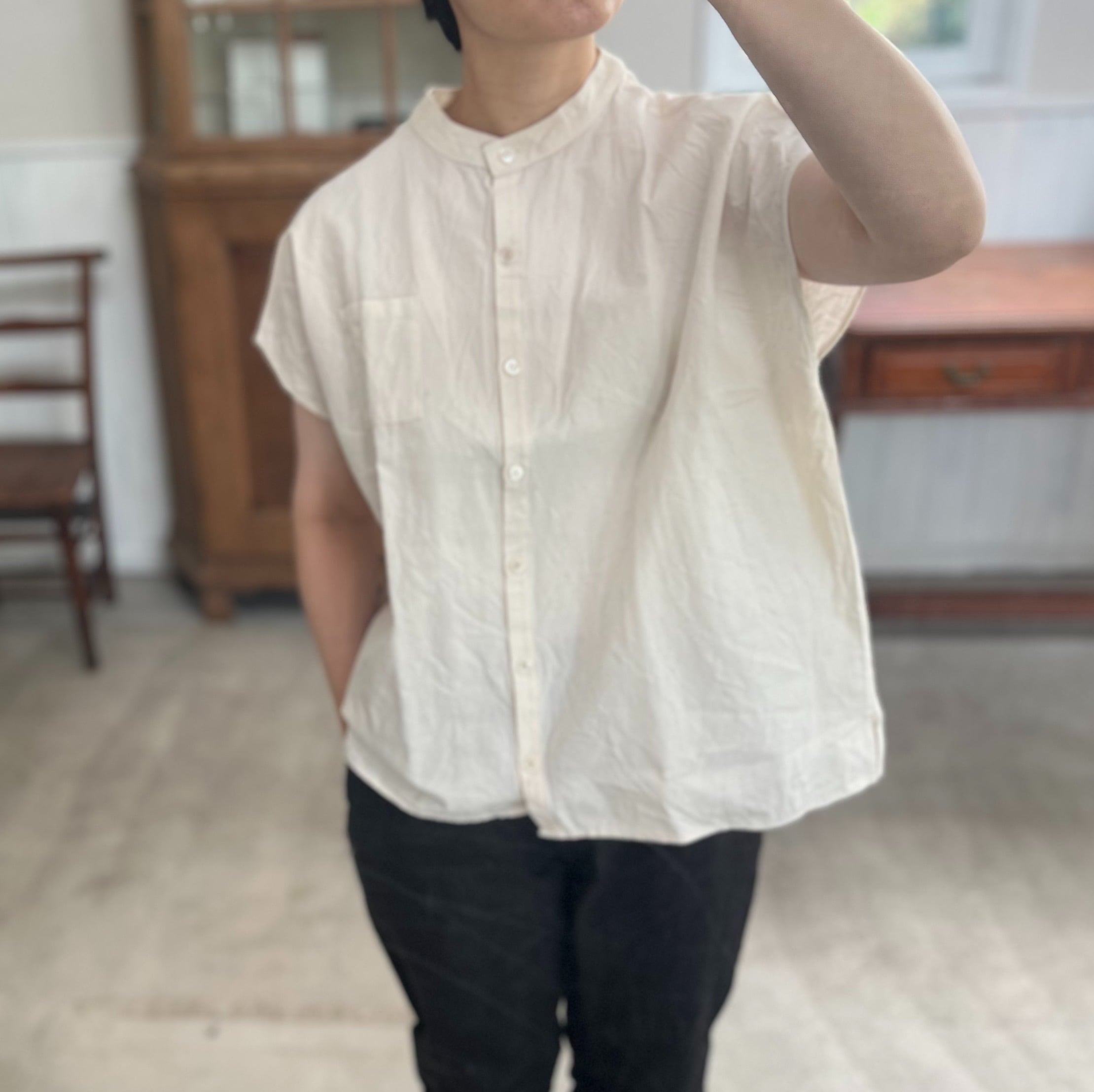 肩周りと身幅が非常にゆったりとしたボックスシルエットのスタンドカラーシャツ。