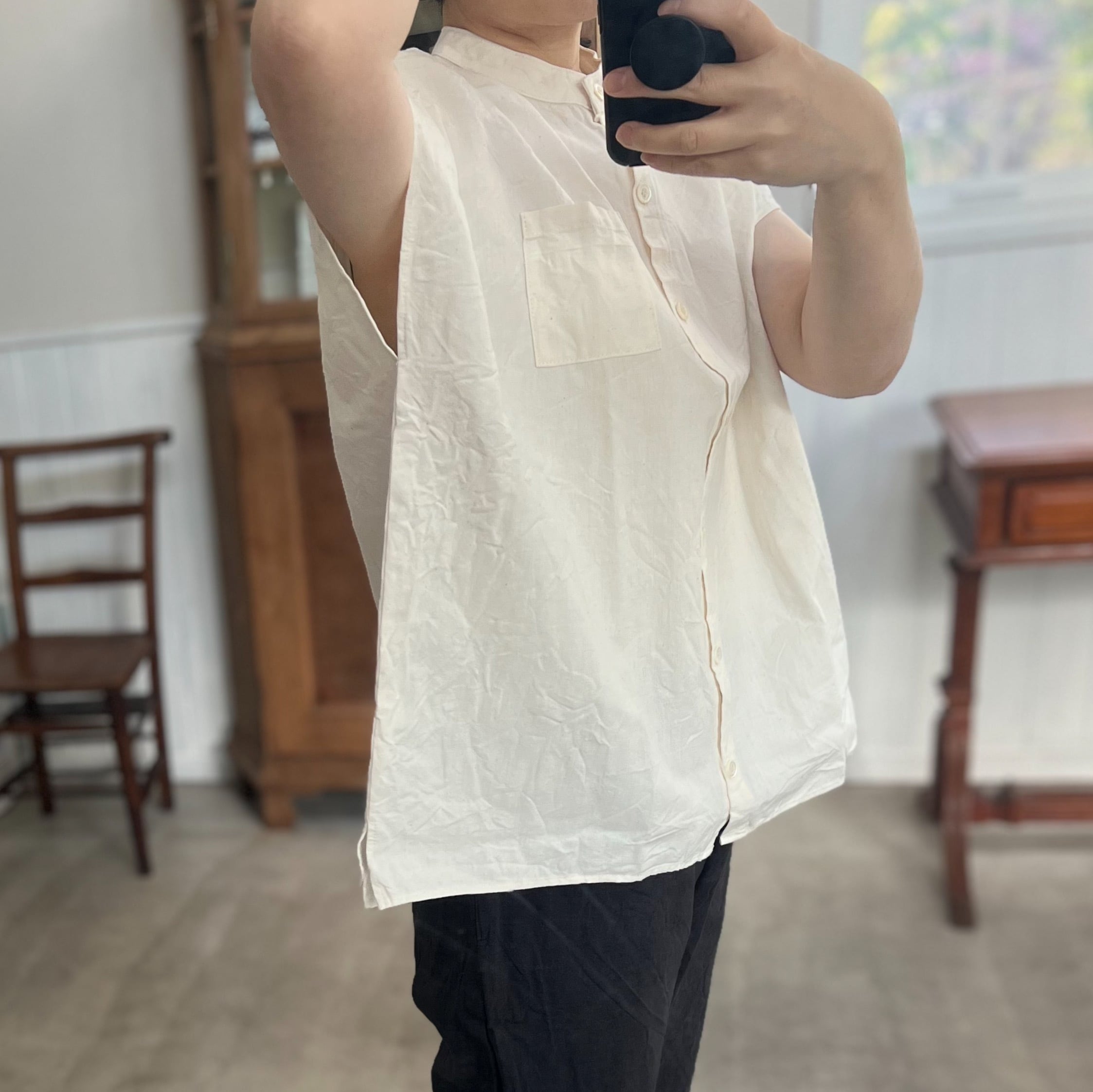 袖なしタイプですが、身幅が広いので着用するとフレンチスリーブになります。こちらは丈を10cm足していますので、腰周りをカバーしてくれます。
