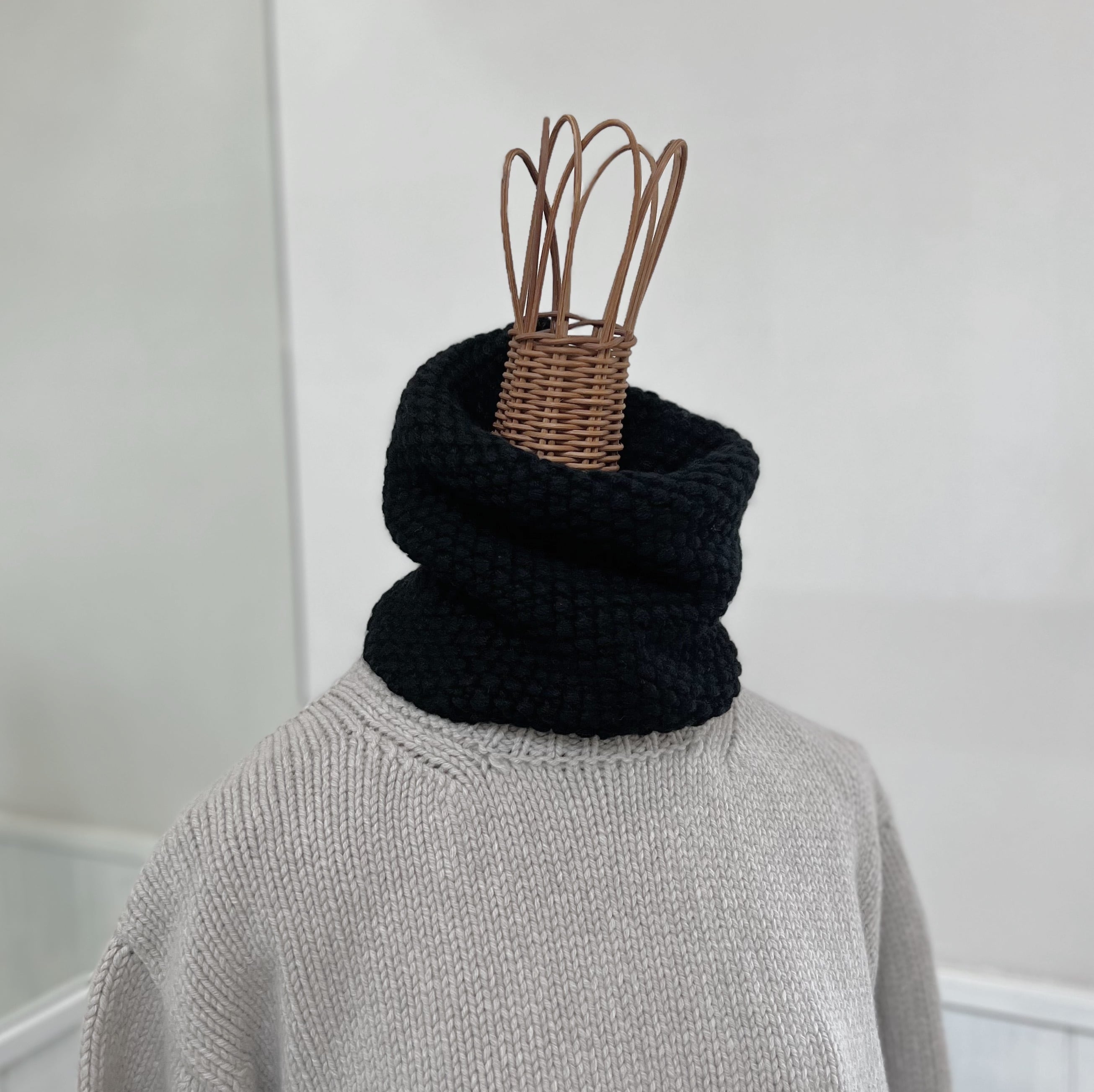 ポコポコとした編み模様が印象的なこのスヌードはしっかりと厚みがあり、首元を温めてくれます。